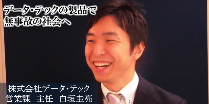 営業課主任の白垣氏の入社は10年前。データ・テックの製品の可能性と社会貢献性に惹かれ、新卒一期生として入社した。現在は営業マンとして、最前線で活躍する傍ら、商品開発や今後の販路の拡大まで任され、会社の仕組みづくりまで手がける。白垣氏は、データ・テックのドライブレコーダーをより多くの企業に導入して道路交通事故を減らし、年間130万人を超える事故死者を減らしたいという想いのもと、日々走り続けている。『仕事をすることは、交通事故の死者や重大な負傷者を減らすこと』と考え、データ・テックの製品、仕事に誇りを持っている。今回は、白垣氏から見たデータ・テックについて語ってもらった。