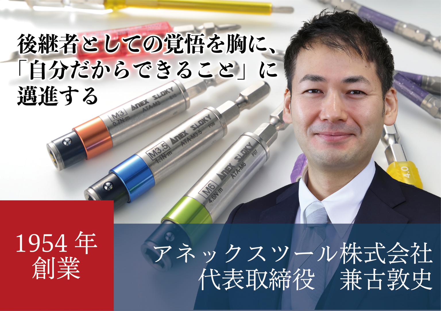 先代(父)社長は、兼古製作所からアネックスツールと屋号を変え、ドライバーを主とした工具のリーディングメーカーとして事業基盤を築いた。3代目として、期待とプレッシャーがある中で、自らの道を切り開く覚悟を持ち、会社を成長させる使命感を持つ兼古社長。
