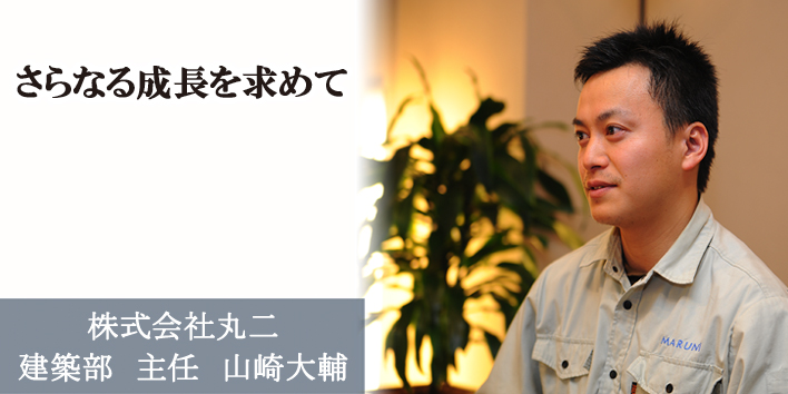 株式会社丸二で建築部の主任として活躍する山崎さん。現在は東京都武蔵野市エリアを担当し、お客様からの要望をもとに、各々のお客様に最適なリフォームの提案を行っている。現在入社4年目の山崎さんは、成長環境を求めて前職を退社、同社にやってきた。もちろん楽しいことばかりがあるわけではなく、時には苦しむこともあるという。しかし、株式会社丸二という、仕事人として、そして一人の人間として成長をしていけるこの環境に身を置いたことが、人生に多くのプラスをもたらしているのだ。若手の成長株として同社に好影響を与え続ける山崎さんに、同社における仕事のやりがいや今後の目標についてお話を伺った。