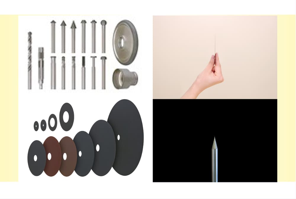 レジノイド極薄切断砥石とは、ダイヤモンドなどの粉粒砥材を熱硬化性合成樹脂 (レジノイド) で固結成形した回転砥石で、ダイヤモンド・CBN電着工具は、金属製の台金上にダイヤモンド・CBNの超砥粒を電気メッキ(ニッケル)で固定した工具だ。